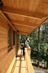 恵まれた敷地であることから計画は敷地の性状を極力専重したものとし,残された擁壁,基礎はほぼそのままとした.極力段差のないプランとするため,斜面上部に基礎部分を置き,張り出した床版の先端で軸力をポストで支持し,その上に木造架構を組むかたちをとっている.木造の架構は南に比較的大きい庇をつくり北側に積まれた補強コンクリートブロック造の上,サポートとして設けた鉄のフレームに載る.コンクリートブロック造のキッチン,風呂などの部分を北側に配したが,北側隣接の擁壁との関係,ある程度の蓄熱量のあるシェルターとする意図による.ブロックは二重積みとし中間の空気層内側で断熱した.木造部分の室内は比較的大きな一室空間であって,クローゼットの箱が寝室部とその他を区画するのみである.建具が箱から出て視覚的に閉じることができる工夫をした.