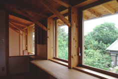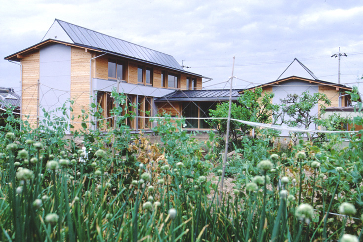 例によってこの建物も「外気取入屋根集熱型暖房換気システム」を導入しているが,建主からの希望によるものでもある.主屋と離れを別々の系統とし,主屋棟では一般的な方式に少々手を加えている.屋根の南面のみを冬の集熱や夏の夜間放射冷却の対象範囲とするのが通常の方式だが,ここでは2本の棟ダクトを設けることにより,北側の屋根も積極的に利用することを試みている.夏の日中,屋根面の熱くなった空気の排気を北面でも行い,日没後短時間に棟ダクト内の温度を下げ,夜間の放射冷却・冷風取入れ運転に早く移行することを目指したものである.またほかにも,太陽光発電,合併浄化槽の自主的な導入など,建主の提案にもよりいくつもの環境共生技術を試みている.