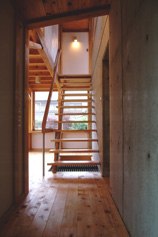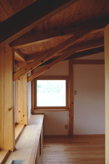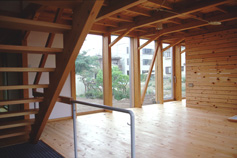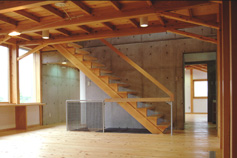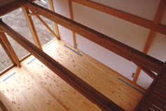 架構は柱梁を方杖状の部材で固着したスパン5.4mの門型のもの,それを1.2mピッチごとに連ねる.柱材はすべてヒノキの通し柱で120×210mm,梁はスギ材で2階床梁は120×270mm,登り梁は120×240mmの断面をもつ.北側の主屋棟と南側の予備室棟を縦につなぐ鉄筋コンクリート造の筒状の部分が横力の吸収に役立つ構造計画となっているが,もちろんキッチン,浴室など火や水を使用する部位の配置と関連しての選択によっている.また,地下室の設置が地上階での一部鉄筋コンクリート造の選択を容易にした.